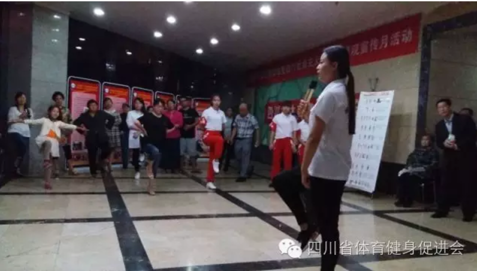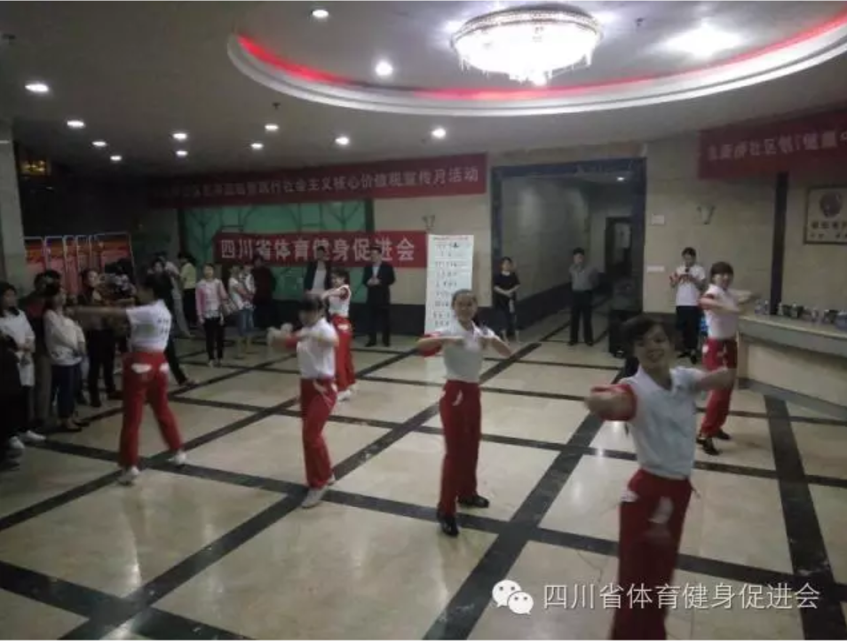 随后,由成都体育学院的四川省体育健身促进会优秀志愿者代表为我们带来健身操表演,获得全场居民的阵阵掌声。